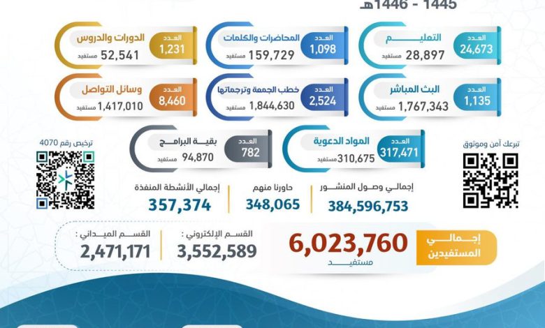 في إنجاز نوعي يعكس أثرها في نشر رسالة الإسلام وتعزيز قيم الدعوة، أعلنت جمعية الدعوة والإرشاد وتوعية الجاليات بالجبيل عن تقريرها السنوي لعام 2024م، الذي شهد قفزة كبيرة في عدد المستفيدين من برامجها، حيث بلغ إجمالي المستفيدين 6,023,760 مستفيدًا.
