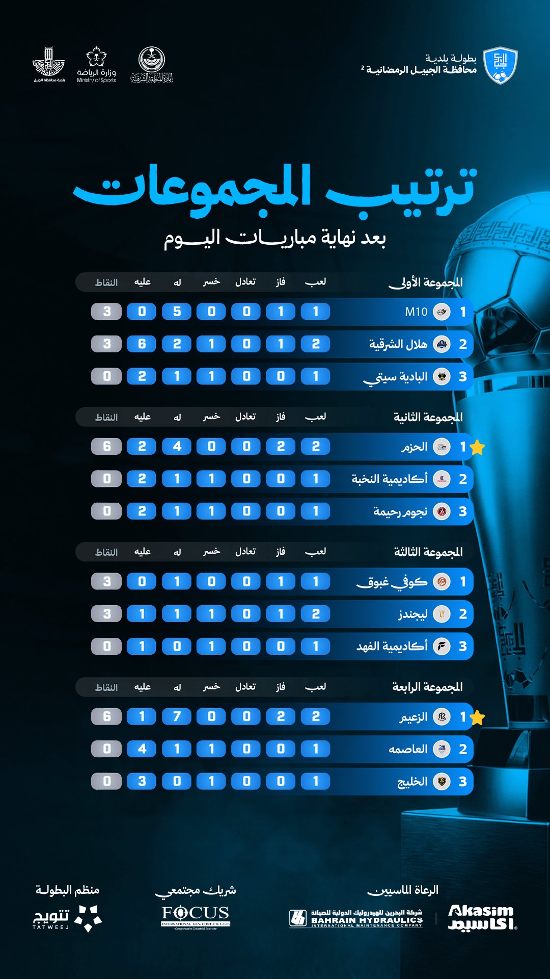 تـرتـيـب المجـموعات بعد نهاية مباريات اليوم الرابع في بطولة الجبيل