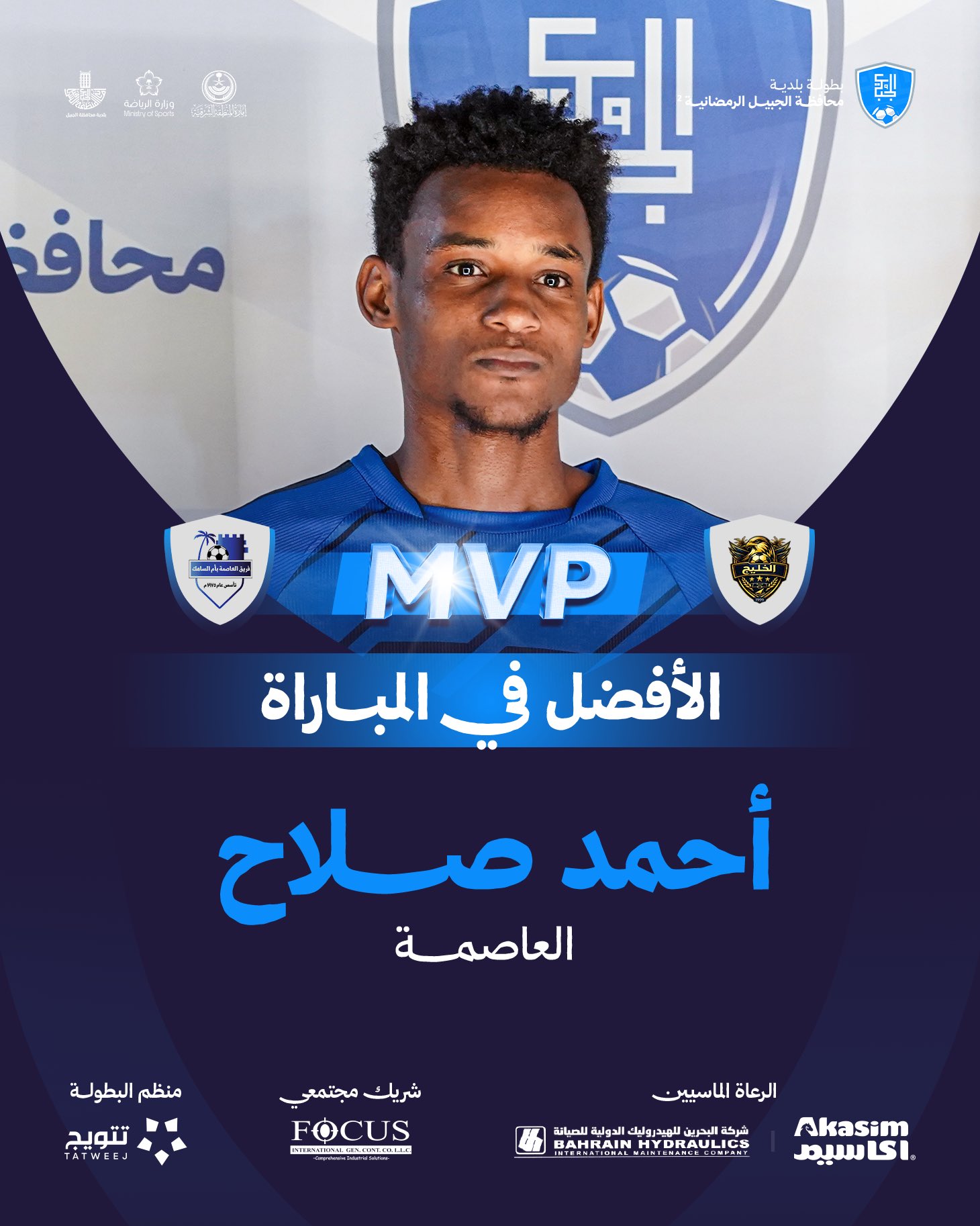 كما تُوّج اللاعب أحمد صلاح من فريق «العاصمة» بجائزة أفضل لاعب في المباراة، نظير مستواه الفني المميز وتأثيره المباشر في مجريات اللقاء، حيث تسلّم الجائزة من سعادة الأستاذ مانع آل شيبان مدير إدارة الاتصال والإعلام بـبلدية الجبيل.