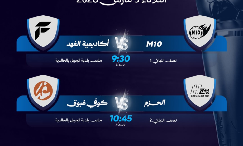 وتُقام المباراة الأولى عند الساعة 9:30 مساءً، حيث يلتقي فريق أكاديمية الفهد مع فريق M10، فيما تجمع المواجهة الثانية عند الساعة 10:45 مساءً فريقي كوفي غبوق والحزم، في لقاءين يُتوقع أن يشهدا تنافساً قوياً لحجز بطاقتي التأهل إلى النهائي الكبير.